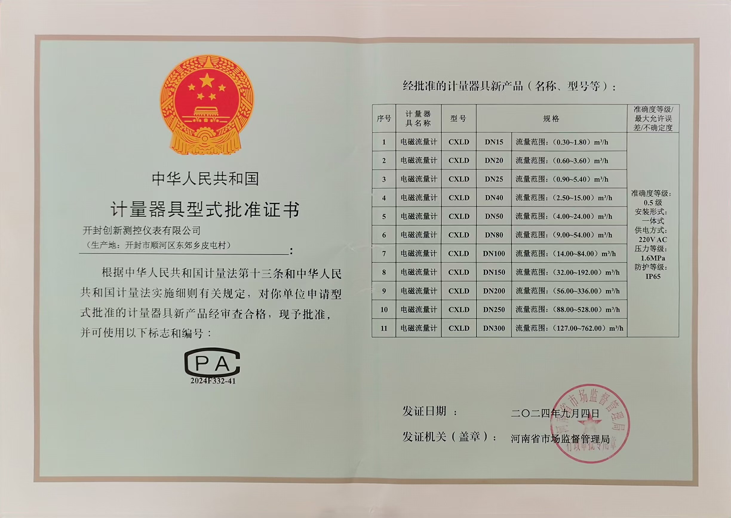 電磁流量計(jì)型批證書